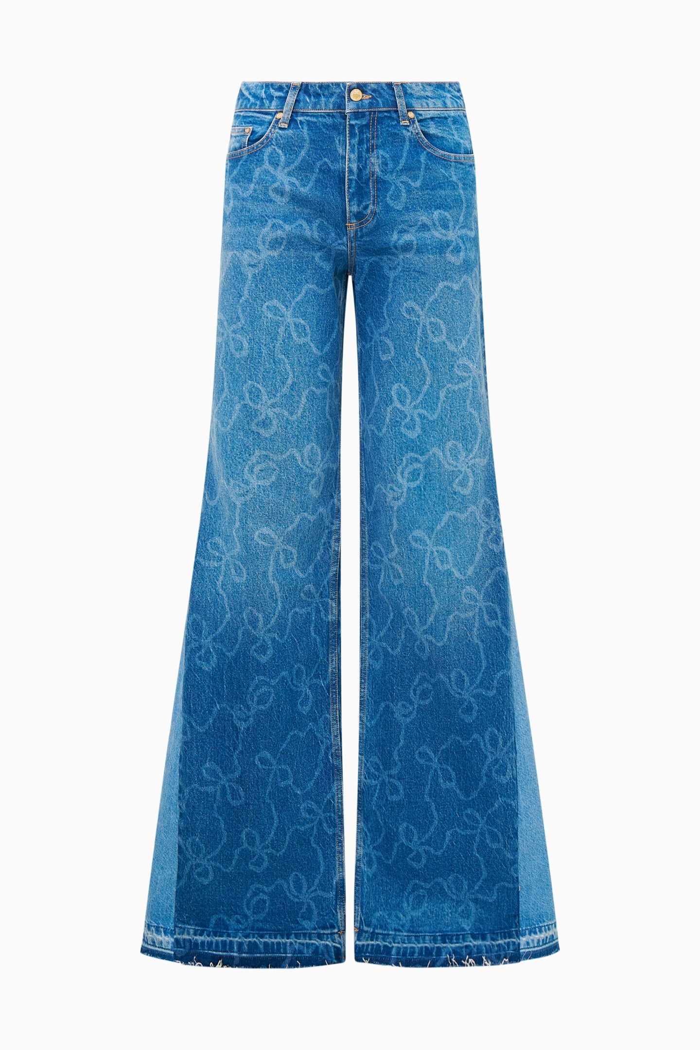 So in love with the Ambrina Jeans. These 70s-inspired jeans have our signature Luna Rosa Beaux print lasered into the denim giving it a resist look with fading in certain areas. With a wide leg and flare bottom, the mid rise jeans have a solid contrast triangle gusset at the leg. They have a regular fit until below the knee which they then flare out.