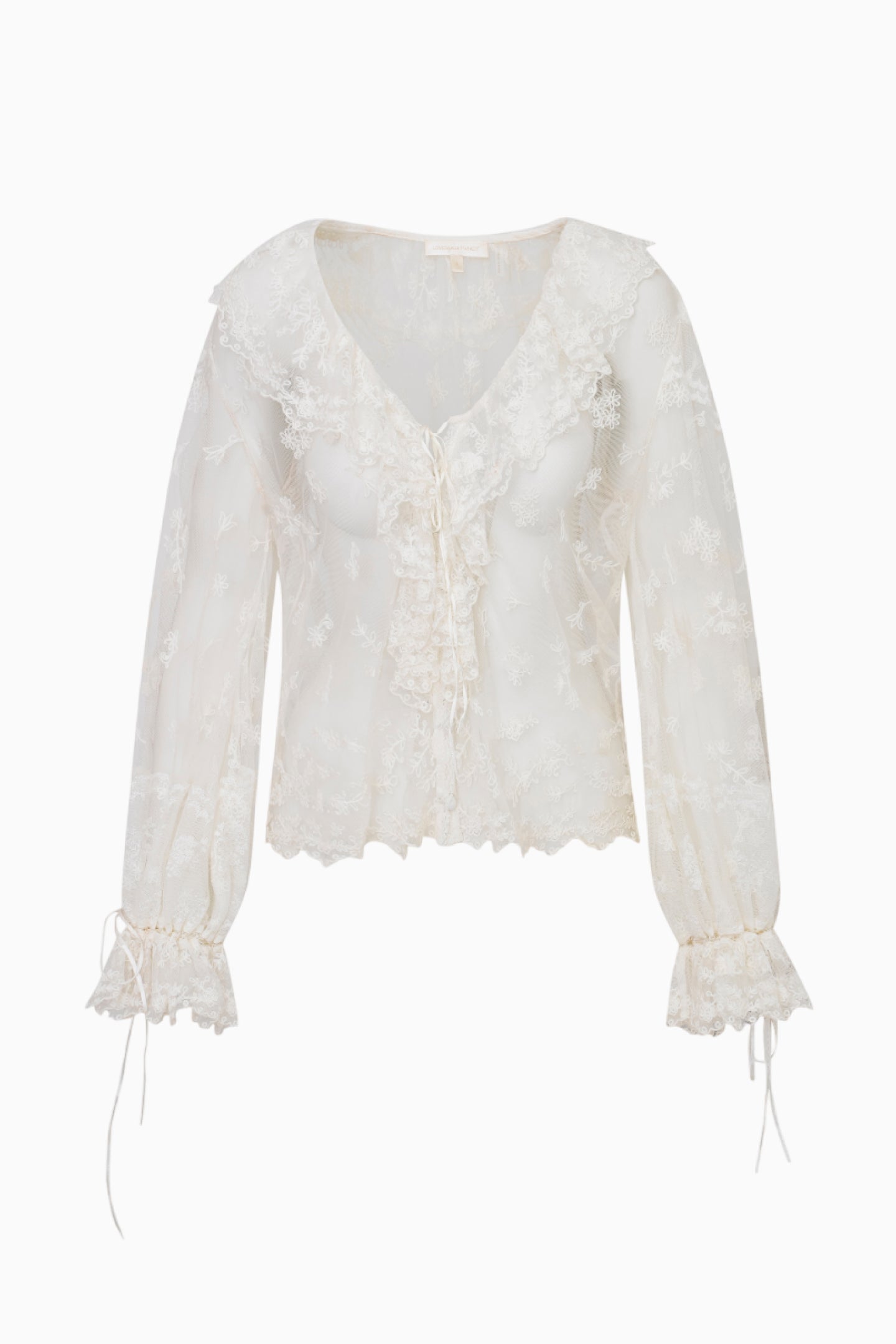 Effortlessly chic in the Aubrenna Top. This romantic, Bohemian-inspired top arrives with delicate, embroidered flowers dancing amongst a lightweight mesh fabric. The blouse features a V-neckline adorned with ruffles that cascade down the center front. A center front slit with buttons gives this piece a flirty, airy detail. Billowing long sleeves feature delicate ribbon ties and ruffle cuffs. This piece comes with a separate chiffon cami.