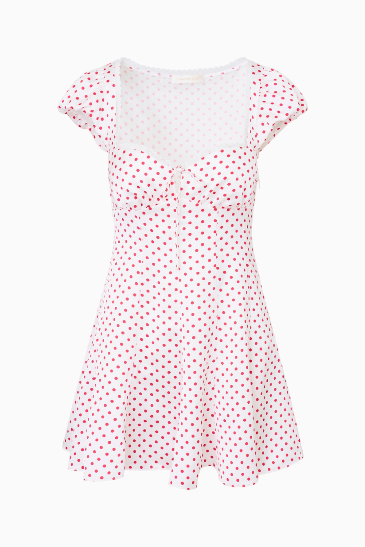Introducing the Avine Dress. This flirty mini features a playful polka dot print reinterpreted a spirited red-and-white all-American colorway. The A-line piece begins with short cap sleeves that fall to a square neckline above an empire waist that nips at the sides which then goes to an airy skirt.