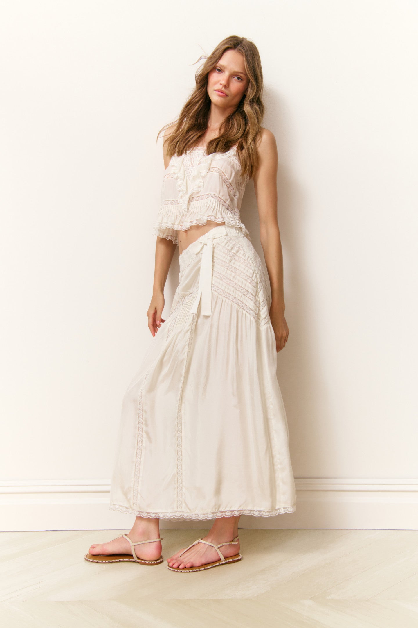 Introducing the Beloria Skirt. Designed from a luxe, silk habotai fabric, this pretty Victorian-inspired maxi stuns with intricate laces and pintucking details throughout, a ribbon threaded through lace at the waist, a body-hugging fit at the hip that releases slightly into a modest A-line skirt. The piece is finished with a zipper.