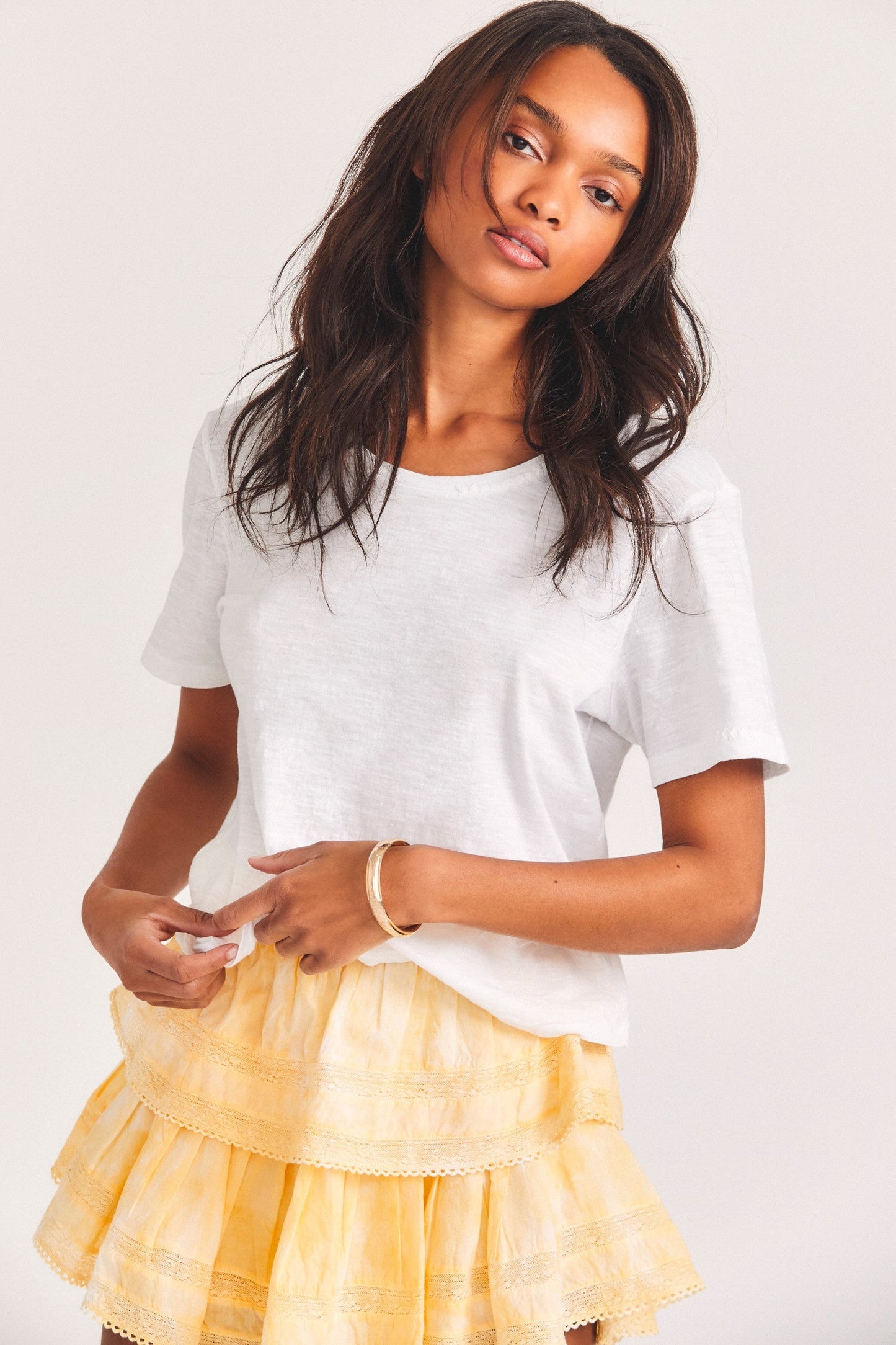 Our Calix Tee returns, your new favorite t-shirt in 100% hand tie-dyed cotton with distressed edges. This easy top has a loved look with its classic scooped crewneck, short sleeves and relaxed fit. Pair it with one of our many Ruffle Mini Skirts.