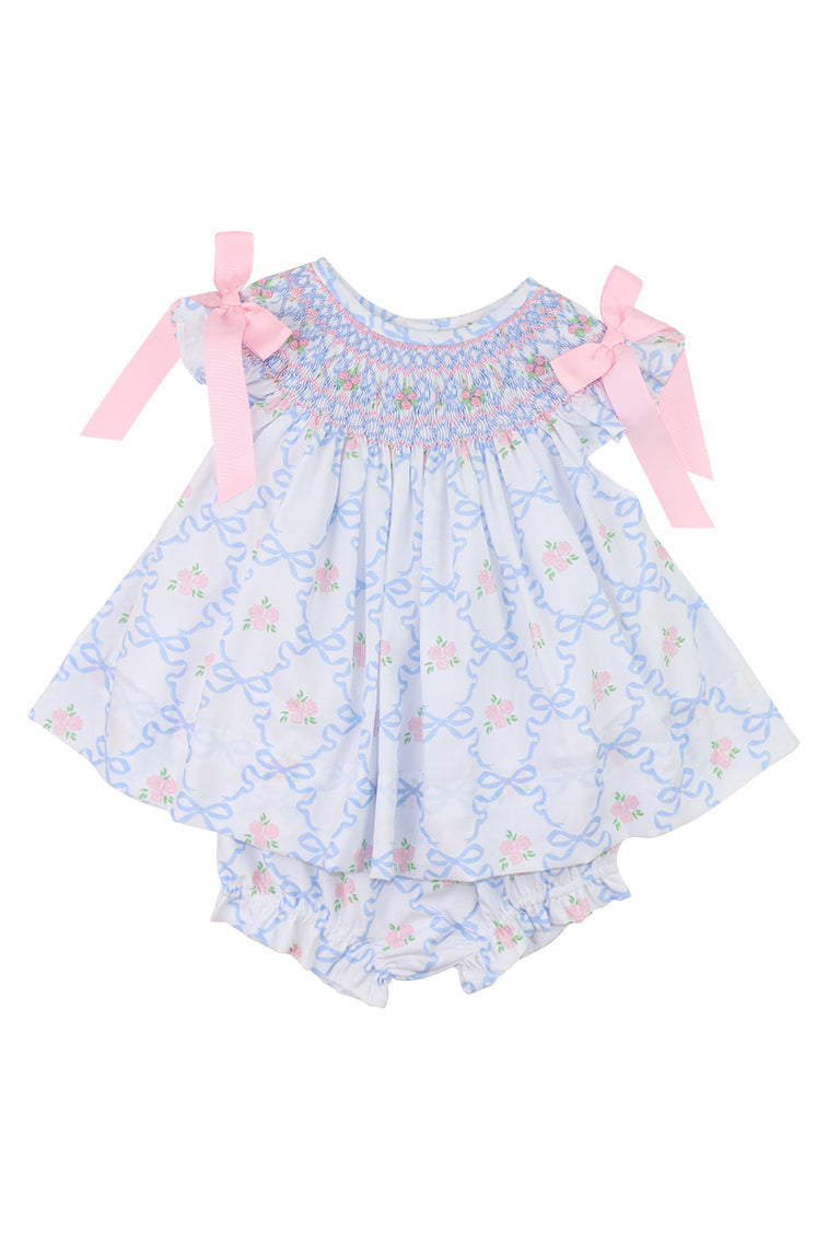 She is sure to dazzle in this sweet set that features darling bouquets of soft pink roses, nestled among beautiful streaming blue ribbons. Exquisite geometric hand smocking includes petite rosebuds to mimic the gorgeous soft floral pattern. Add feminine flutter sleeves adorned with the prettiest pink grosgrain bows and you have a breathtaking set that she will be absolutely stunning in.