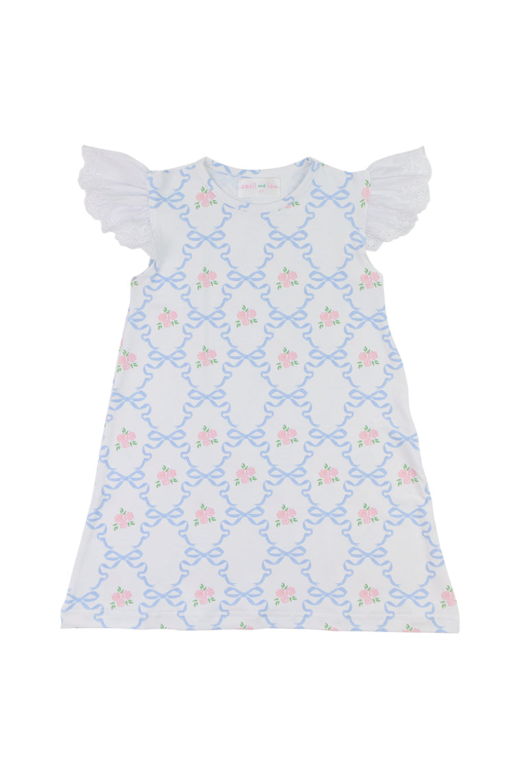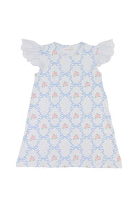 Your little darling will shine in this precious summertime dress crafted for comfort in soft, supple knit that feels so good and features a beautiful print of rose blossoms and flowing blue ribbons. Delicate Angel sleeves are delightful in eyelet lace and add an angelic touch she will love!