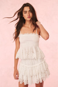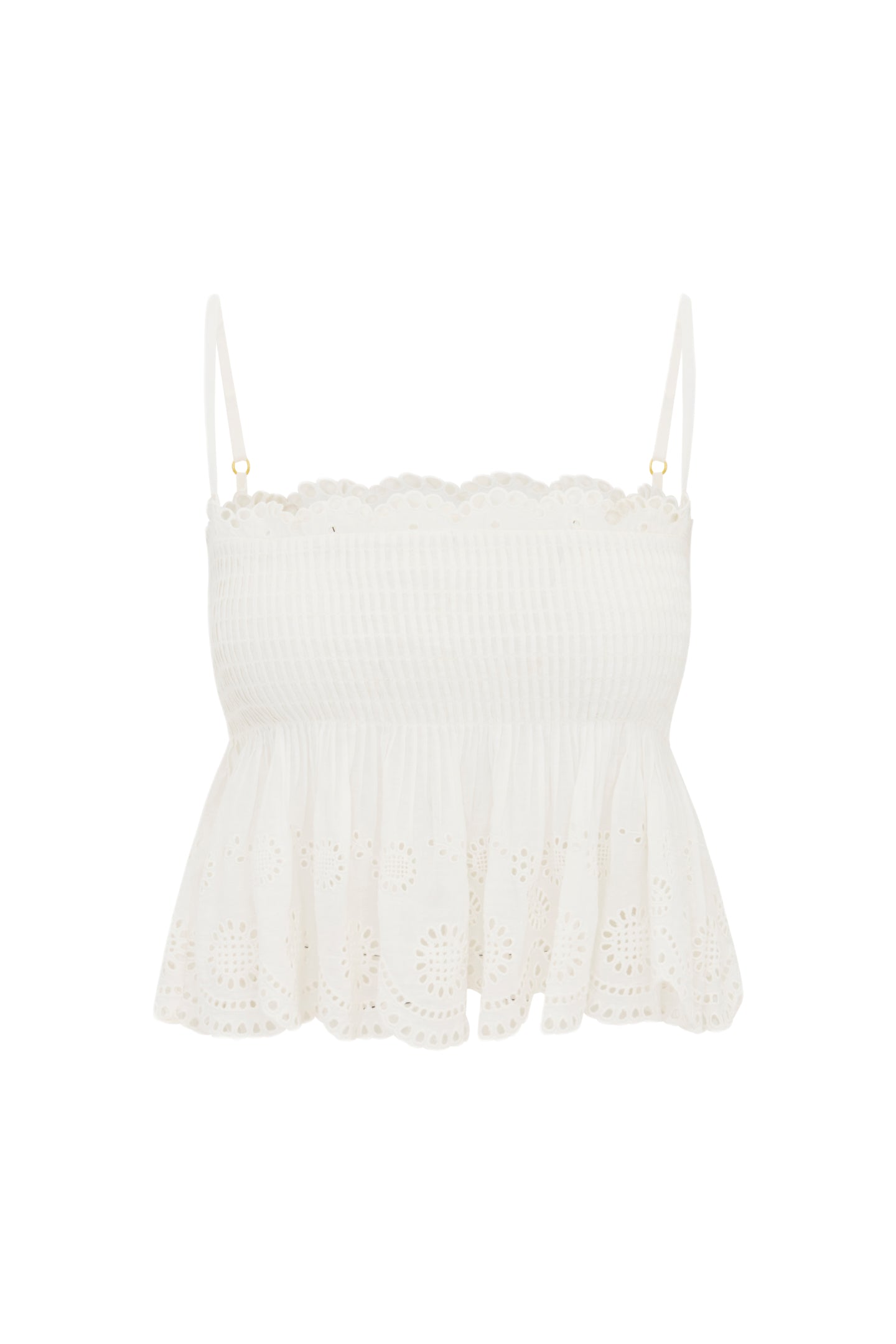 Effortlessly chic in the Condie Top. Designed from an airy cotton, this pretty piece arrives with a beautiful medley of custom-made, large-scale scallop floral eyelet details mixed with smaller eyelets. The smocked top features adjustable spaghetti straps and releases into a peplum hem for a feminine finish.