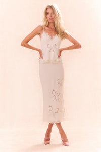 Introducing the Darion Skirt. Designed with a luxurious, lightweight crepe fabric, this midi has a drapey, chic effect with a mermaid bias silhouette. A beautiful mix of whimsical lace applique bows are embroidered on the front, while the inside waistline is elastic for an easy and comfy pull on. The piece is finished with scallop laces on the hem.