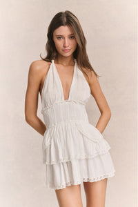 Our favorite Deanna Halter Dress returns for the season. This low-cut convertible halter ties in a generous bow at the neck and be crossed at front. Below a wide smocked waistband, the skirt flares to smaller details at the hips and two ruffled tiers. Pair your mini dress with our heritage Avignon Crop Cardigan.