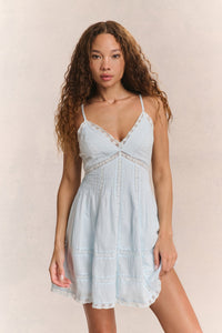 Our Docila Dress is a flirty mini designed with a flattering silhouette with lace insets and pintucking details. The dress features a smocked back, spaghetti straps, and an airy skirt finished with lace.