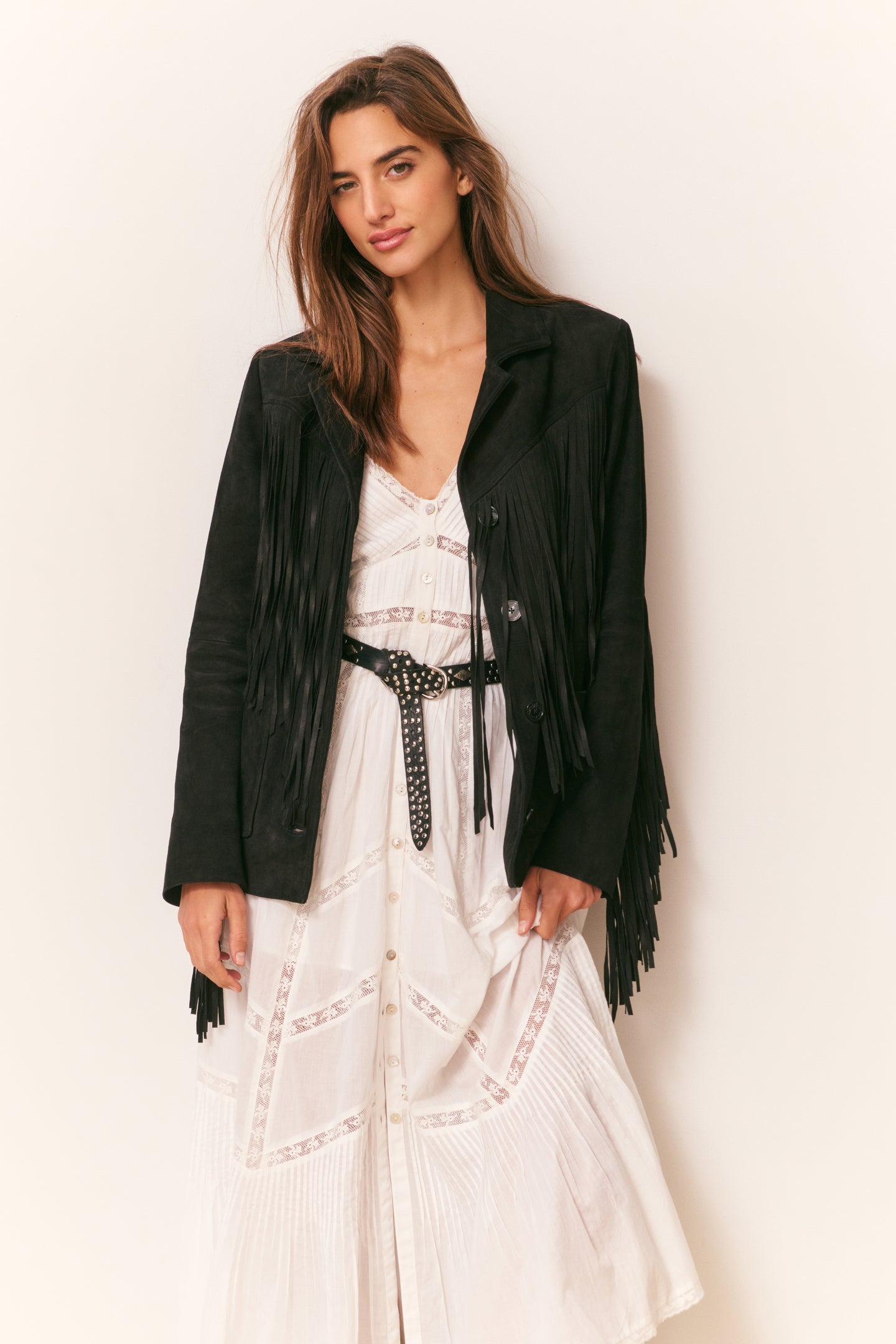 Our best-selling Geraline Jacket is back, this time in a chic, black suede. Adding a playful touch to your look, this fringe layer is designed from a soft, luxe lamb suede. The dramatic leather fringe details line the entire sleeves, the front and, the back, giving this piece gorgeous swaying movement throughout. This is the statement jacket you have to have.