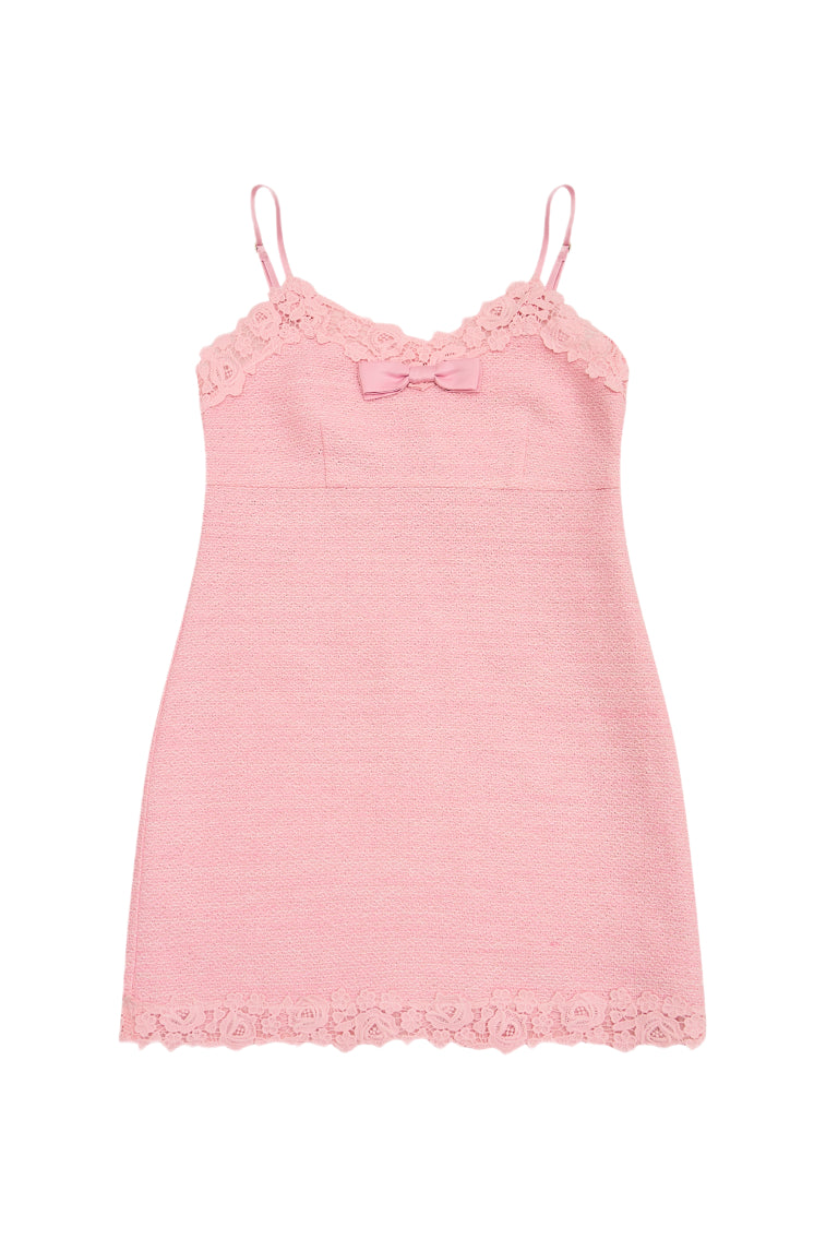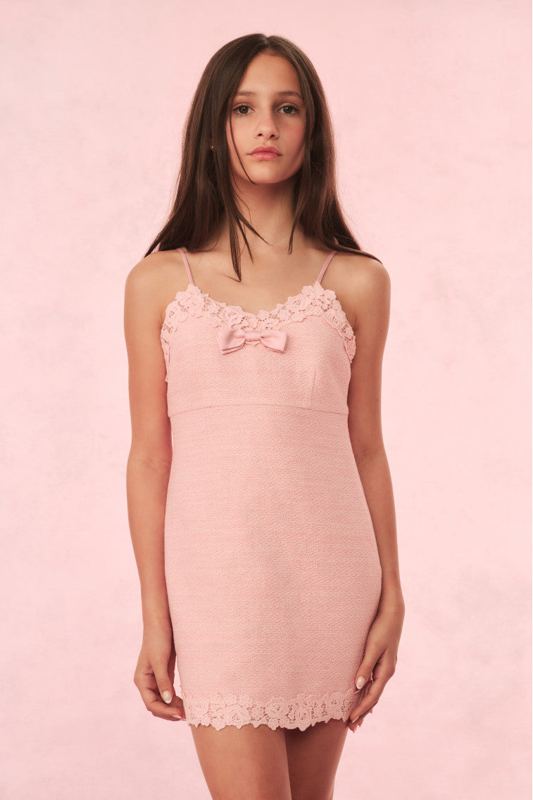 Our girls are chic in the Aloma Dress. This stunning dress is designed from a tailored tweed fabric and features intricate floral lace details. The piece has thin spaghetti straps and a flattering, slim fit silhouette.