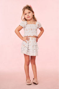 Our beloved Billie Skirt in 100% cotton with our ikat floral print – our original, signature oversized bow. Below a wide smocked waistband, the skirt falls to two shirred tiers with ruffle details.