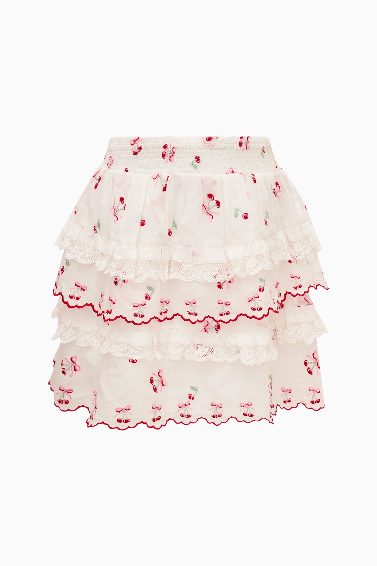 Our beloved Billie Skirt returns as part of our America’s Sweetheart Cotton Collection in 100% cotton with a sweet cherry print. Below a wide smocked waistband, the skirt falls to two shirred tiers with ruffle details.