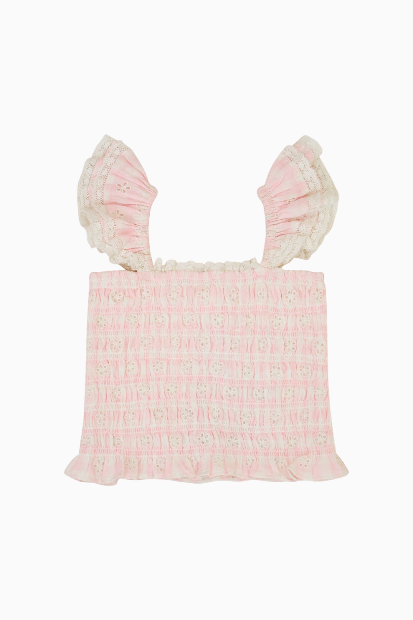 Forever sweet in the Caspia Top. Our little loves stun in this easy, warm weather top featuring tiny flutter sleeves with a ruffle, smocking all over, and a dainty ruffle peplum hem.