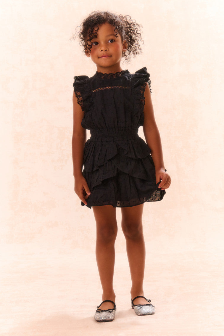 Our best-selling Decker Dress returns for our minis. This easy frock has a ruffle-trimmed collar, buttons down center front, flutter sleeves, an elastic waist and overlapping asymmetrical ruffles at the skirt.