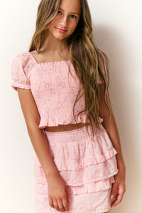 Our girls are so sweet in the Fabielle Top. This charming top is designed from a cotton voile fabric featuring our signature bow fleur print reimagined into tiny ditsy florals printed all over. With short sleeves, the bodice of the top is smocked for ease and comfort and the piece is finished with a slight peplum, ruffled hem.