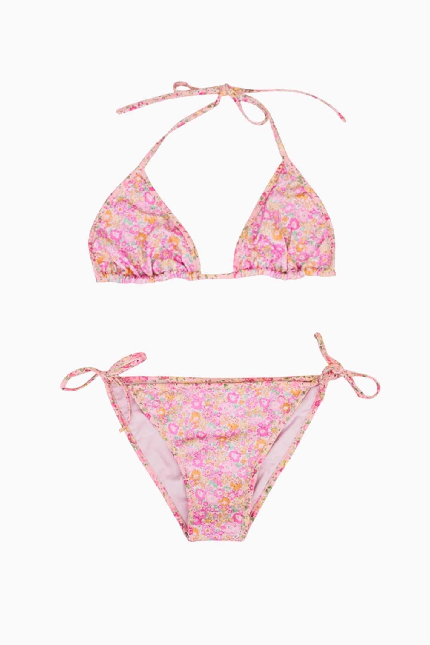 Introducing our latest capsule collection Made with Liberty Fabrics designed into our favorite elevated pieces. The Girls Harbor Bikini returns for the summer with Liberty’s Corsica fabric with a floral print. Just like our best-selling grown up version, this darling two-piece has a triangle top with ruffles lining the interior seams and halter ties. The bottom has self tie details on each side.