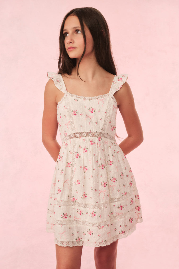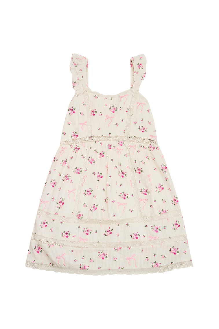 Channeling sunshine in the Laurier Dress. This airy cotton sun dress stuns with our springtime floral print of the season. The piece features tiny flutter sleeves above a square neckline that flows to an airy skirt. This dress is adorned with vintage-inspired lace insets for a dreamy detail.