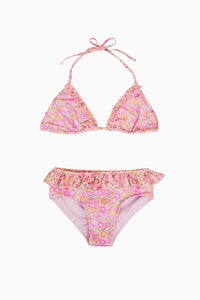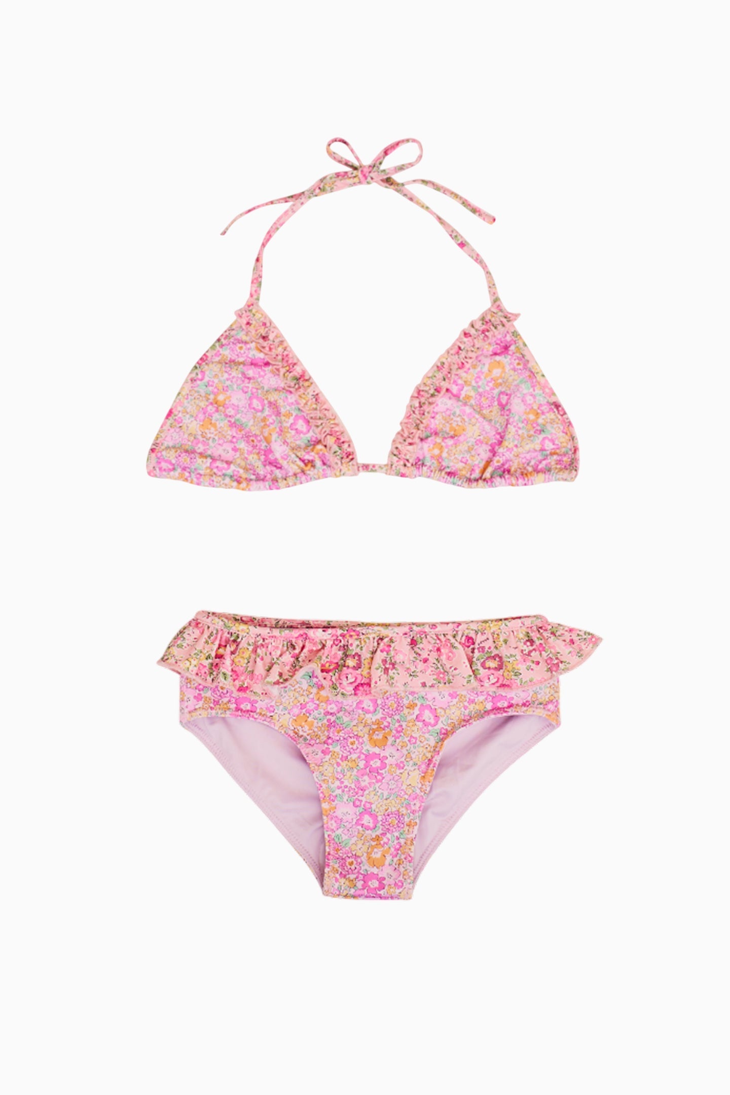 Introducing our latest capsule collection Made with Liberty Fabrics designed into our favorite elevated pieces. The Mini Harbor Bikini returns for the summer with Liberty’s Corsica fabric with a two-toned floral mixed print. Just like our best-selling grown up version, this darling two-piece has a triangle top with ruffles lining the interior seams and halter ties.