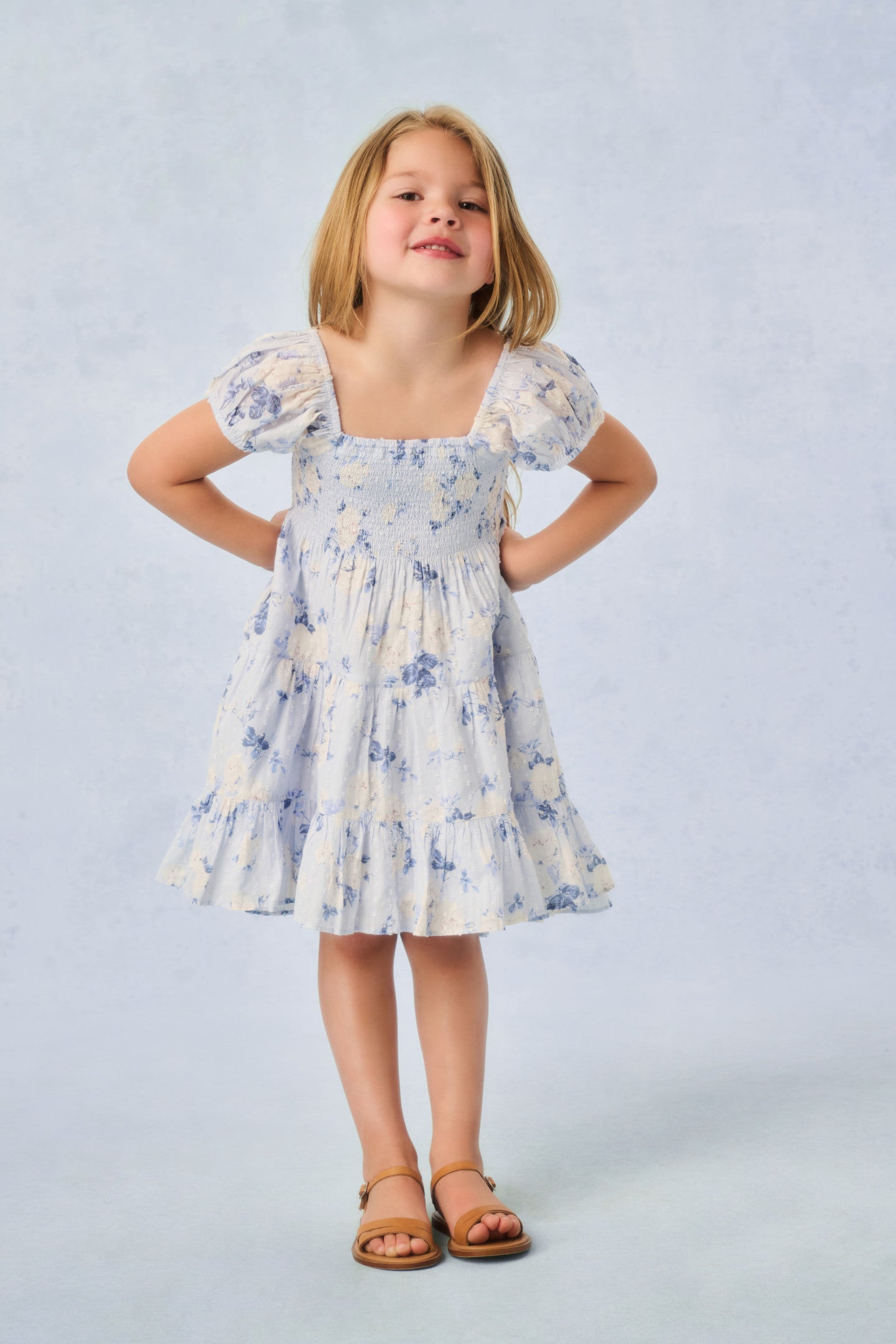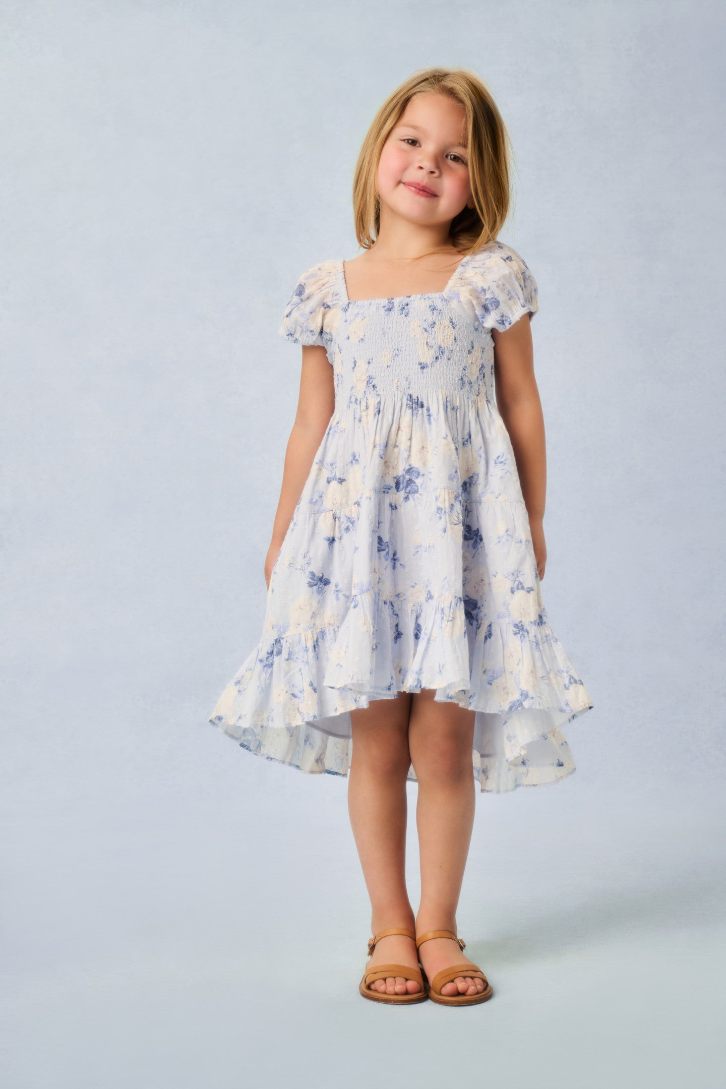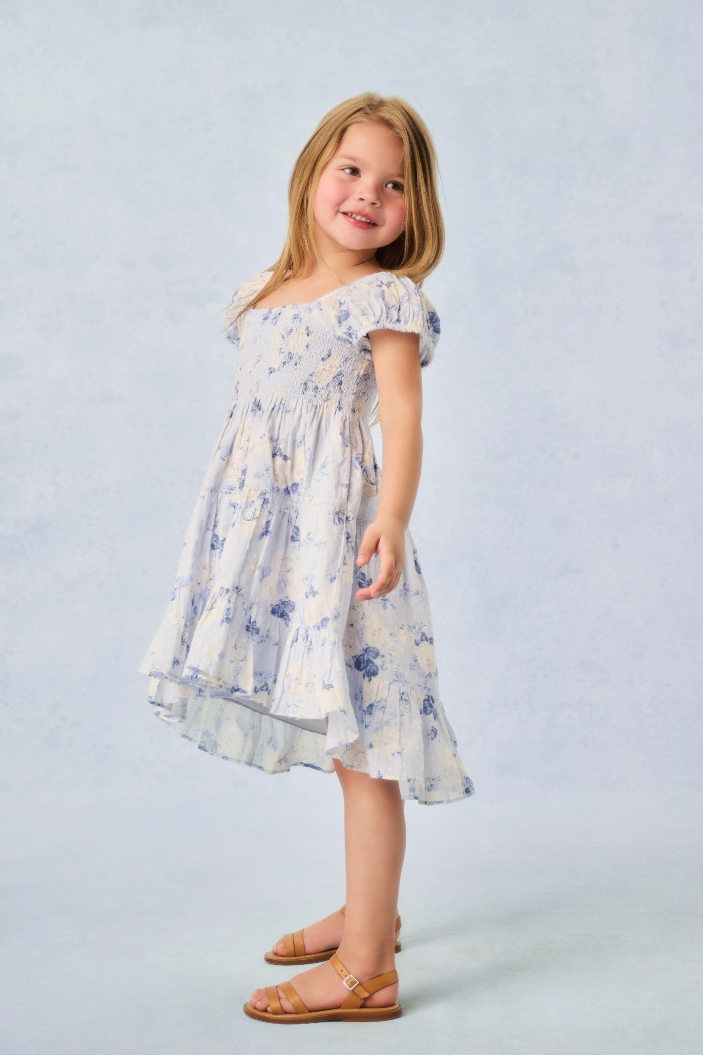 The Muriella returns to match your LoveShackFancy fragrance. In our dreamy fragrance prints, this dress features sweet flutter sleeves, a smocked top falling to a three-tiered skirt with ruffles throughout and an asymmetrical hem.