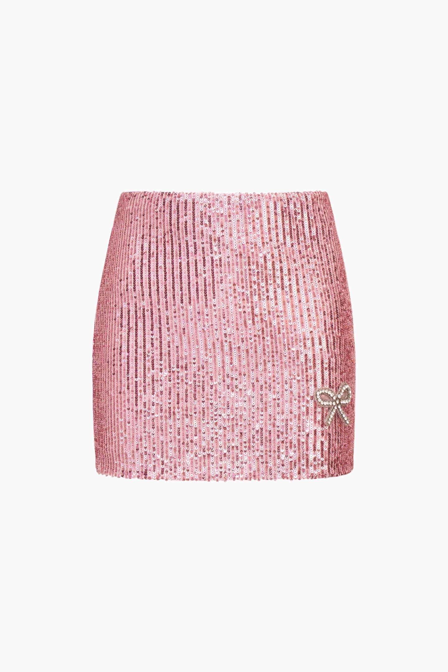 The Nessleigh Skirt sparkles with charm, crafted in pink fabric with a delicate rhinestone shimmer. A twirl-ready A-line silhouette is finished with an embellished rhinestone bow at the bottom corner, adding a signature touch of whimsy. Perfect for little dreamers who love a hint of sparkle in every step. Pair with the Wrenlynn Top for the full set.