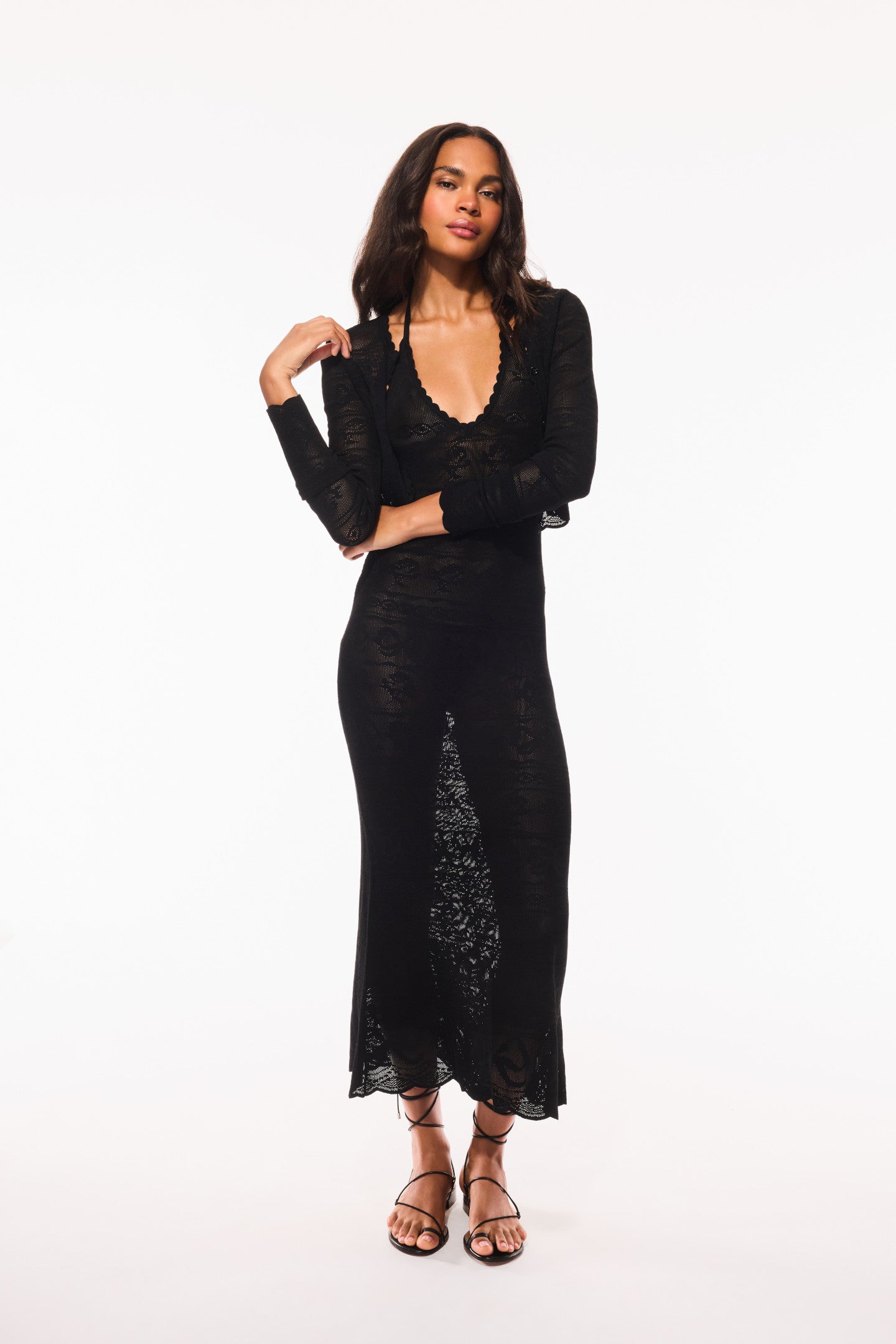 Add a chic layer to your look with the Gretta Cardigan. The charming knit arrives with nice stretch yarn featuring a stunning pointelle jacquard. Patterns of bows and florals are placed throughout the body. With a slim fit, the sweater features a ribbed scallop placket, placed bow and flower motifs, and our custom faux shell buttons.