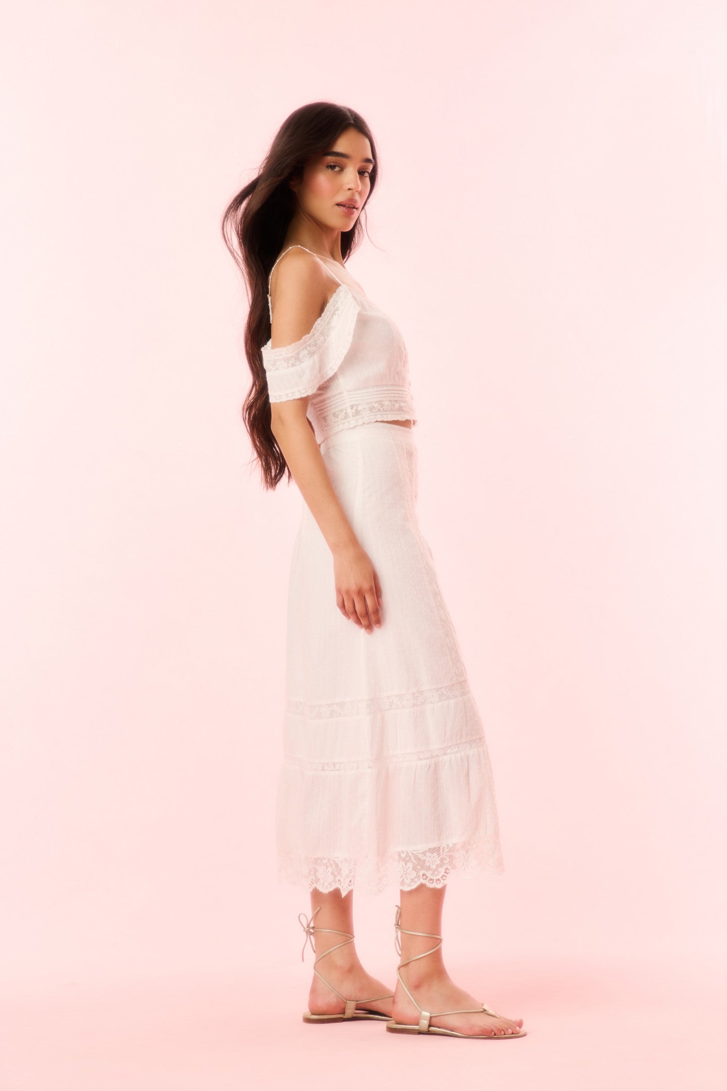 This cropped cami debuts with a cotton fabric adorned with intricate, vintage-inspired lace and embroideries. The fitted top features off-the-shoulder ruffle-like sleeves, buttons down the front, adjustable spaghetti straps, and smocking at the back.