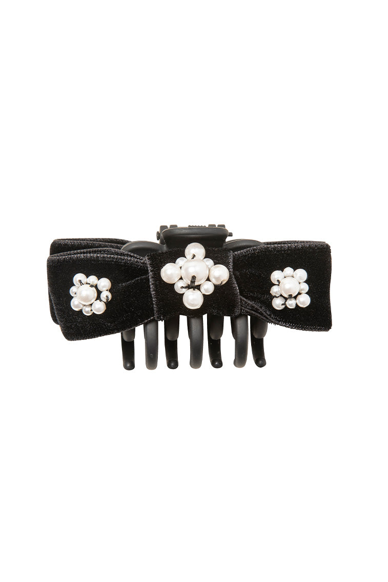 The Maggie Jaw Clip finds our beloved bow shape, hand-embroidered with unexpectedly majestic pearl clusters. Each one is made by hand in New York, using the most luxurious silk velvet ribbon. It’s anchored by a sturdy jaw clip, making it a breeze to sweep hair half-up, all the way back, and into any style in between.