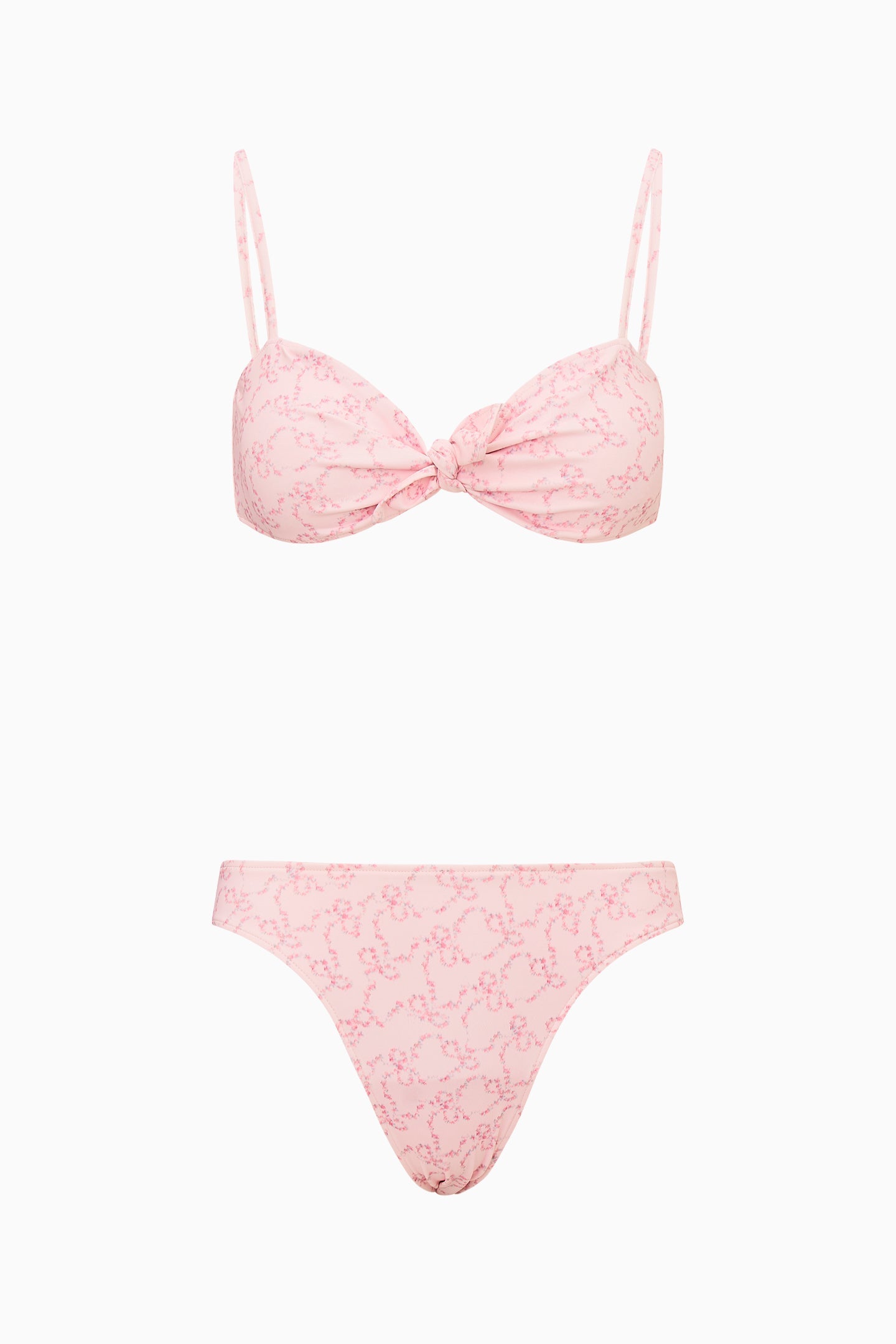 Introducing the Klaudyna Bikini. This sweet swimwear has a tied front for a feminine and flirty look, adjustable spaghetti straps on the top, and low rise bottoms with a little bit of coverage in the back.