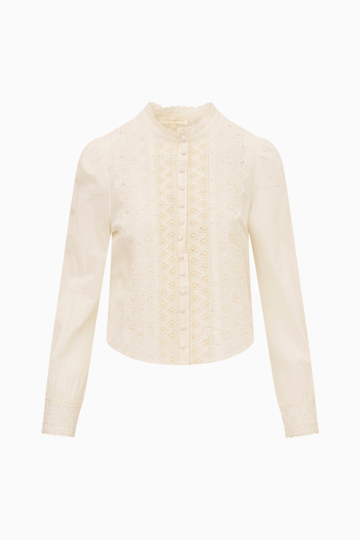The Larine Top reimagines a classic button-down in airy organic cotton voile. Designed in soft off-white, this straight long-sleeve silhouette is adorned with delicate eyelet detailing, traced with dainty pearls along the front placket and collar. Faux self-covered snap buttons make it effortless to slip on and off, while keeping its romantic, vintage-inspired charm. Pair with the Ruffle Mini Skirt for the full set.