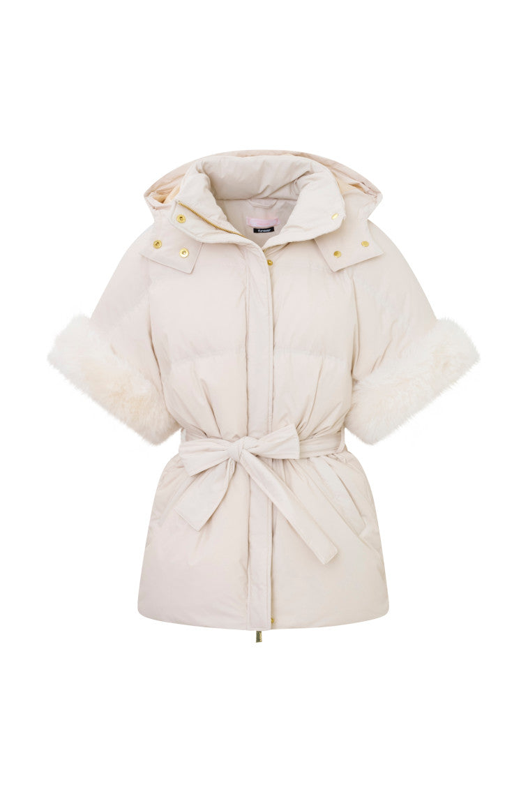 Introducing the Delba Down Jacket from our LoveShackFancy x MAX&MOI collaboration. This trendy piece of outerwear stuns with short sleeves and a warm, luxe down interior. Removable cuffs designed using MAX&MOI’s Furever faux fur adorn the short sleeves giving the outerwear a flirty look. The jacket has an oversized fit, but when tied, the waist belt gives this piece a feminine, and cinched silhouette. A concealed closure beneath a delicate flap and discreet pockets finish this multi-season essential.