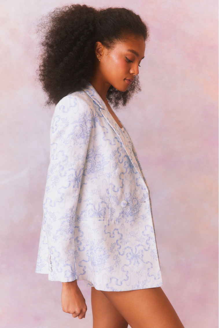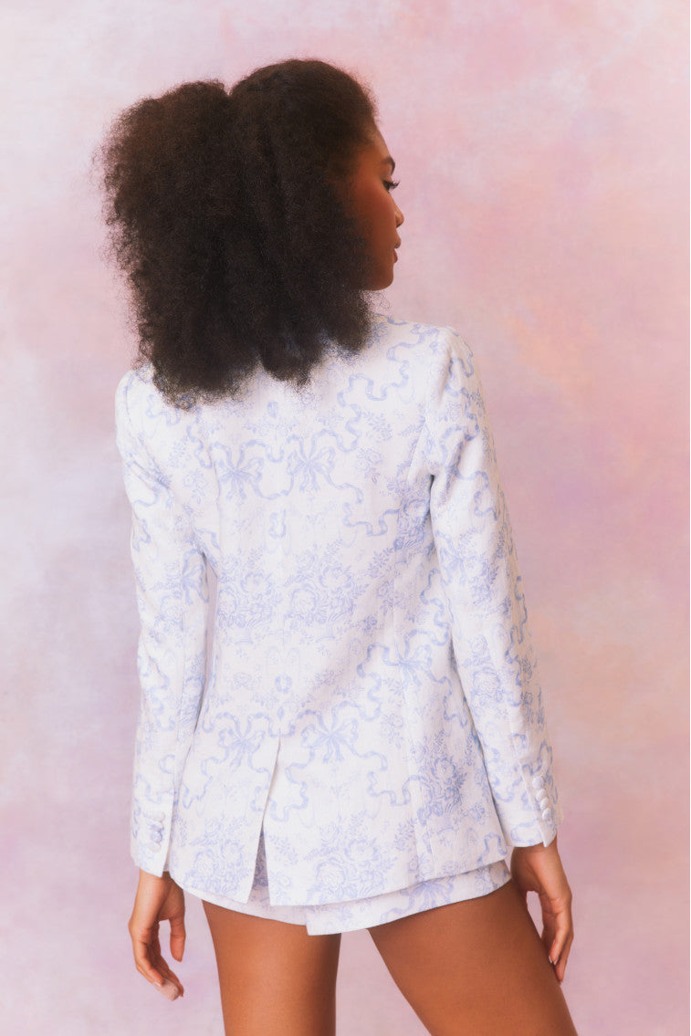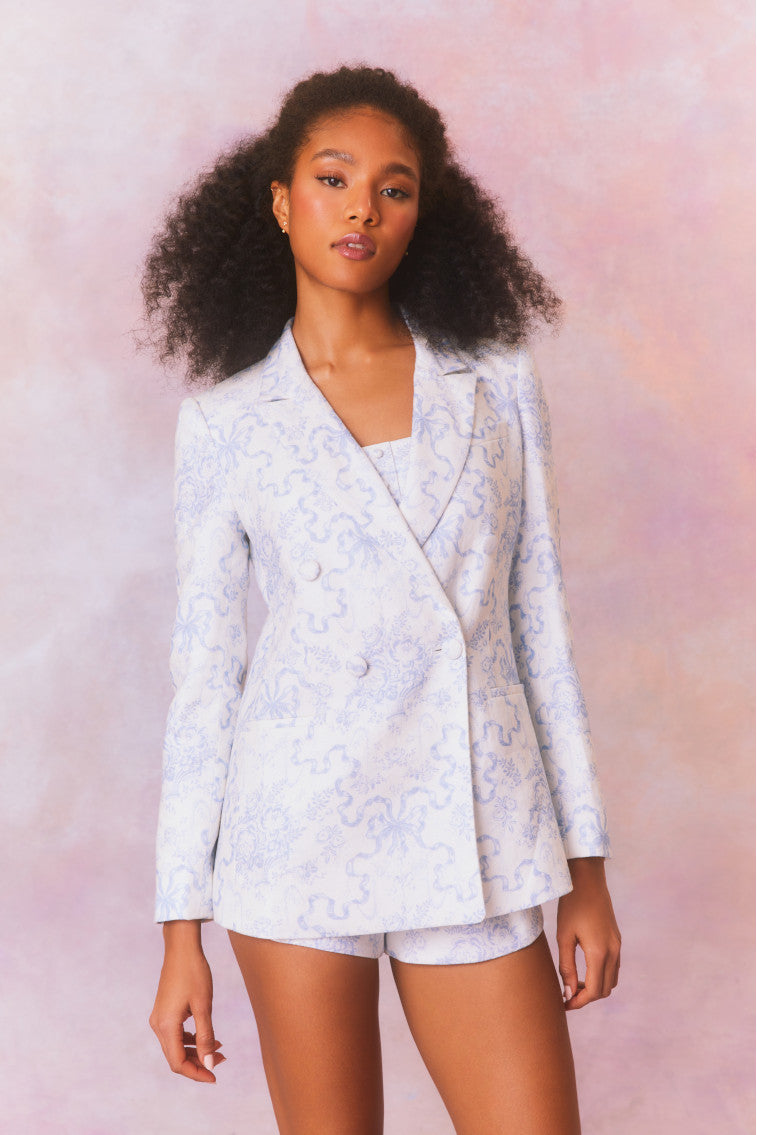 The Lumine Jacket makes its debut with a dreamy, whimsical bow print inspired by antique textiles. Expertly tailored, the double-breasted blazer features structured shoulders, buttons at the front, and a slight cinch at the waist for a flattering silhouette.