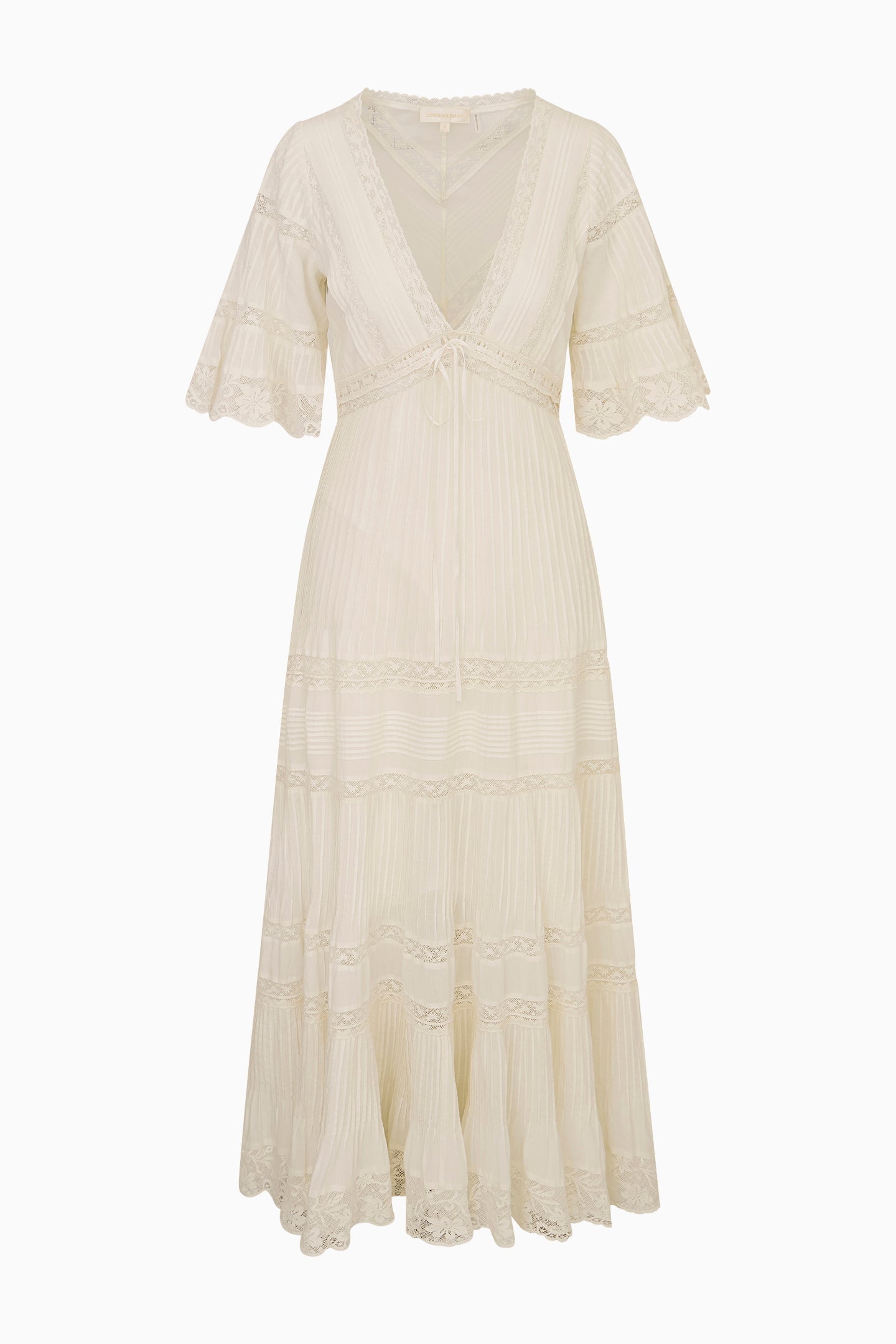 Always charming in the Marlowe Dress. This Victorian-inspired midi dress stuns with a cotton voile fabric. Beginning with a low v-neck, the dress falls to an empire waist and features romantic short bell sleeves that hit at the elbow. The dress falls to a slim, A-line skirt that releases into sweepy tiers with pintucks throughout.