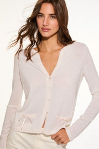 Introducing the Nessa Cardigan. This easy layer arrives in 100% Merino wool, pocket tabs with a satin bow detail. A jersey tubular satin ribbon is woven throughout while self-covered buttons adorn the center front with elastic loops on the front.