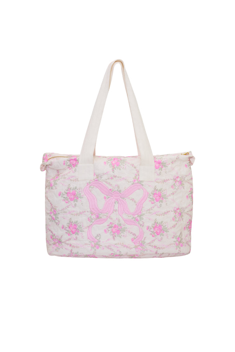 Our Oran Weekender is a LoveShackFancy favorite, reimagined in a floral print. This sizable duffle is quilted and soft with spacious construction, interior pockets and a zipper closure at top.