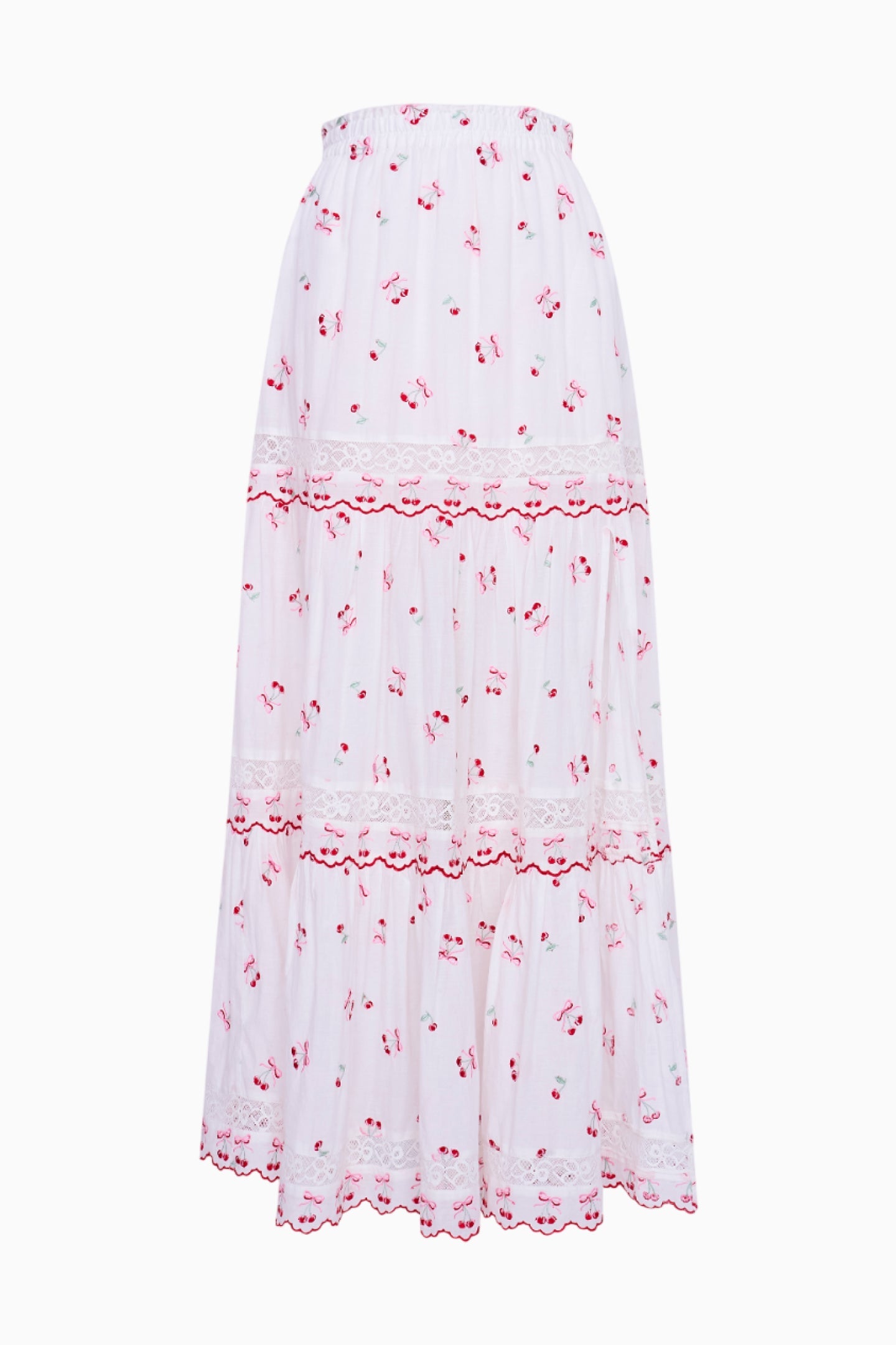 Introducing the Patten Skirt as part of our America’s Sweetheart Cotton Collection. This nostalgic midi stuns with custom developed scalloped trim featuring embroidered dancing cherries all over. With an A-line silhouette, the skirt has smocking at the waist before falling to the multi-tiered skirt. The piece is completed with pockets.