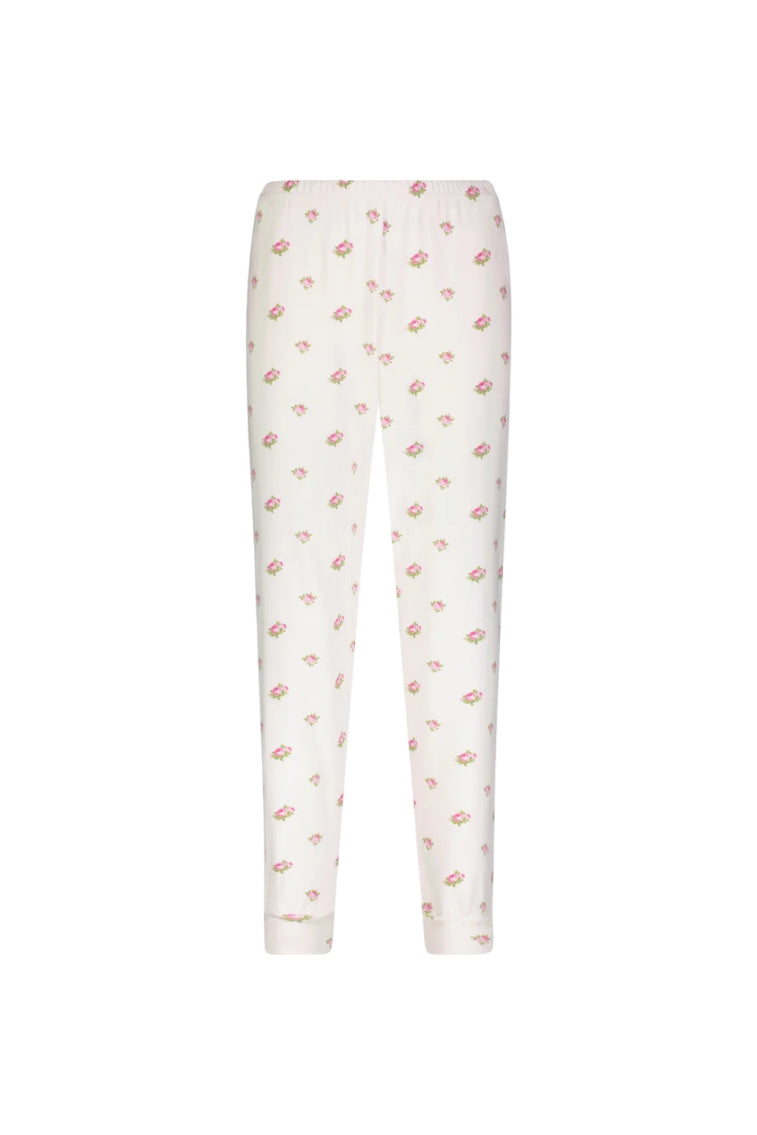 These high rise jogger pants feature cuffs at the ankle and an elastic waist. The pre-washed British heritage knitting shows a custom vintage rose print perfect for cozy nights in.