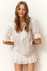 Romance found in the Romilly Blouse. Designed from a cotton voile fabric, this Victorian-inspired top features lace trims and delicate pintucks all over, a threaded ribbon around the v-neckline, and feminine puff sleeves.