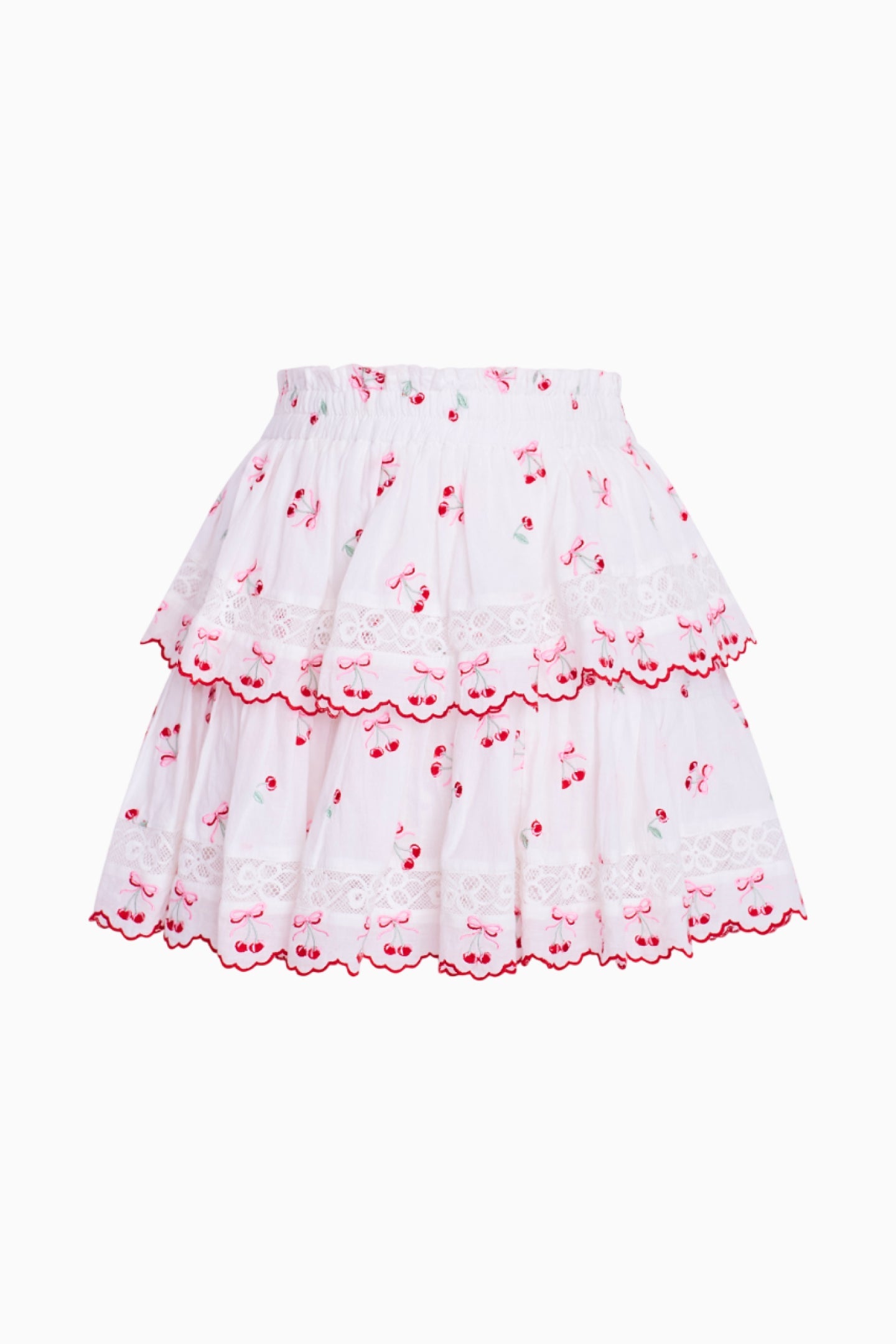 Our best-selling Ruffle Mini Skirt returns as part of our America’s Sweetheart Cotton Collection, this time arriving with custom developed scalloped trim featuring embroidered dancing cherries all over. She features intricate inset lace trims and allover pintuck details. The elasticated waistband offers flexibility in comfort and styling. Tiered ruffles exude effortless femininity. The mini is finished with a frayed, raw hem for added playfulness.