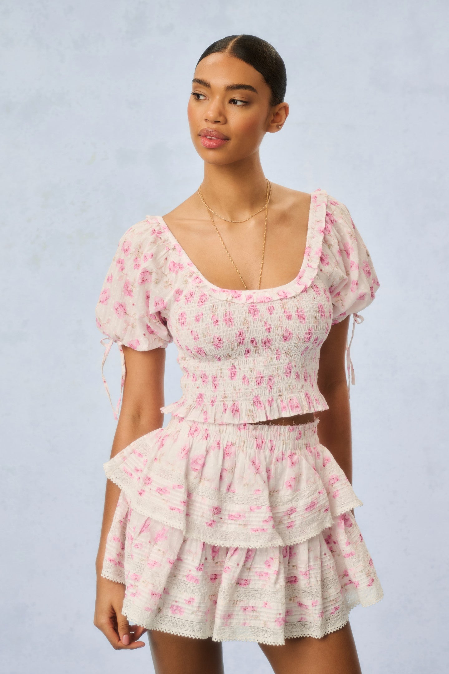 Our best selling Ruffle Mini Skirt returns for the season in our Endless Dreams fragrance print. She features intricate inset lace trims and allover pintuck details. The elasticated waistband and double lining offers flexibility in comfort and styling. Tiered ruffles exude effortless femininity. The mini is finished with a frayed, raw hem for added playfulness. Match your favorite scent to your look with this must-have mini.