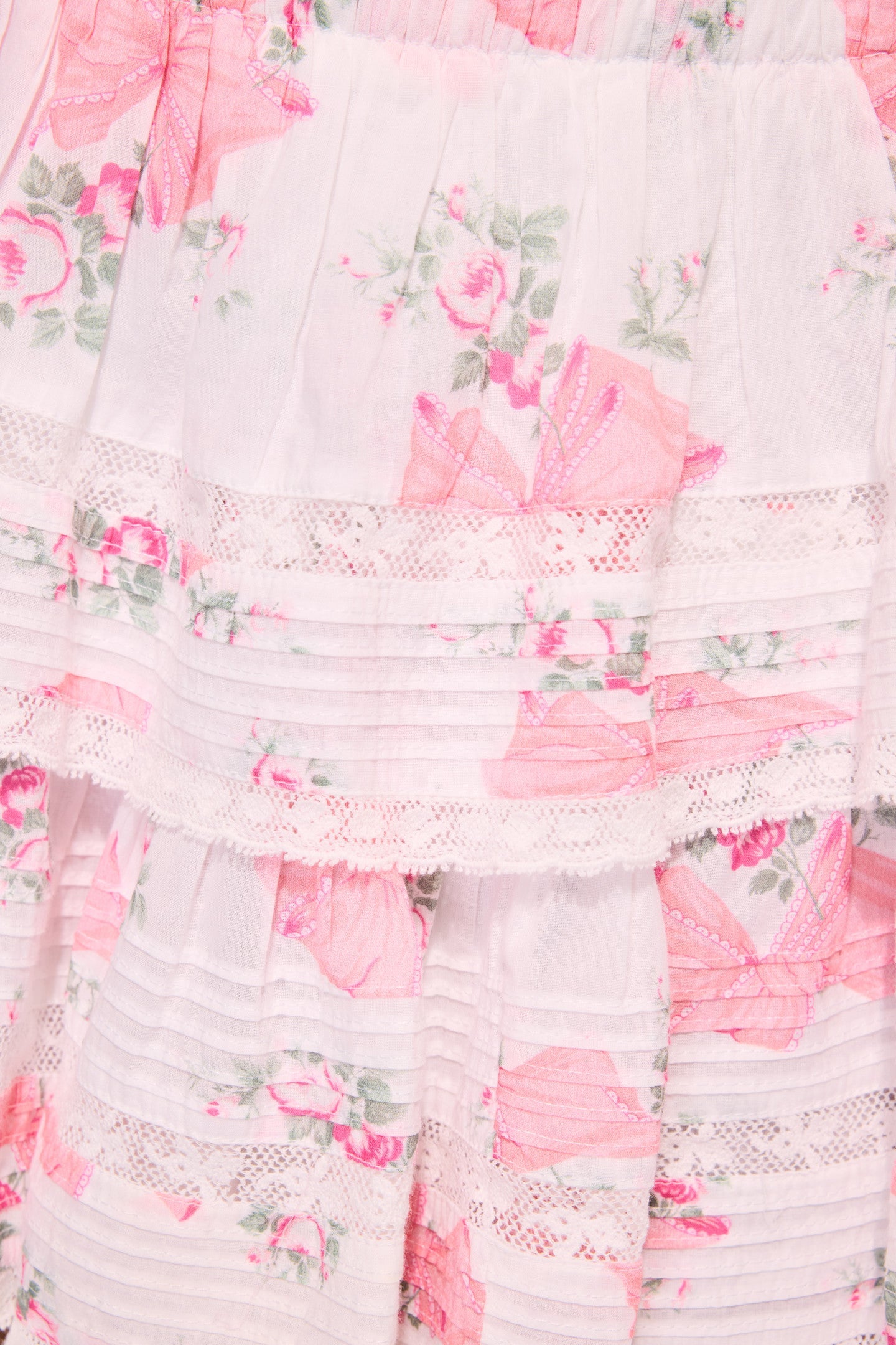 Our best-selling Ruffle Mini Skirt returns as part of our Heirloom Print Capsule featuring our signature Rosa Beaux print made-to-match our Hair & Body Perfume Mists. She features intricate inset lace trims and allover pintuck details. The elasticated waistband offers flexibility in comfort and styling. Tiered ruffles exude effortless femininity. The mini is finished with a frayed, raw hem for added playfulness.