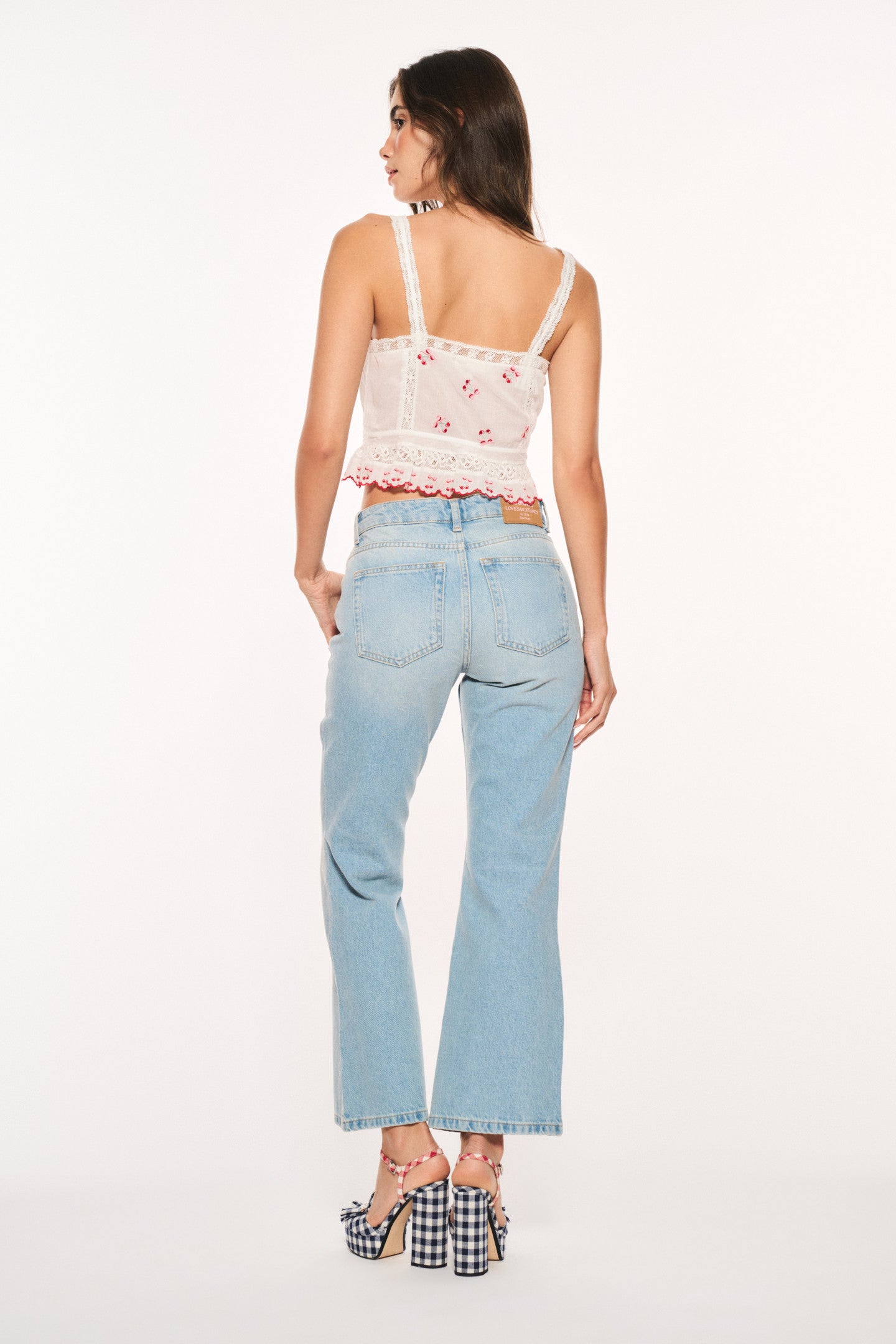 Introducing the Sami Pant as part of our America’s Sweetheart Cotton Collection. These medium rise jeans debut with playful dancing cherry embroidery. With a straight leg fit, the jeans hit at the normal length, including pockets, belt loops, and a center front fly and button closure.