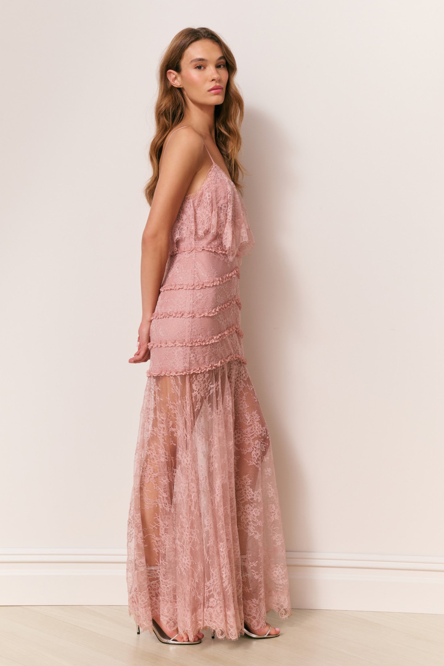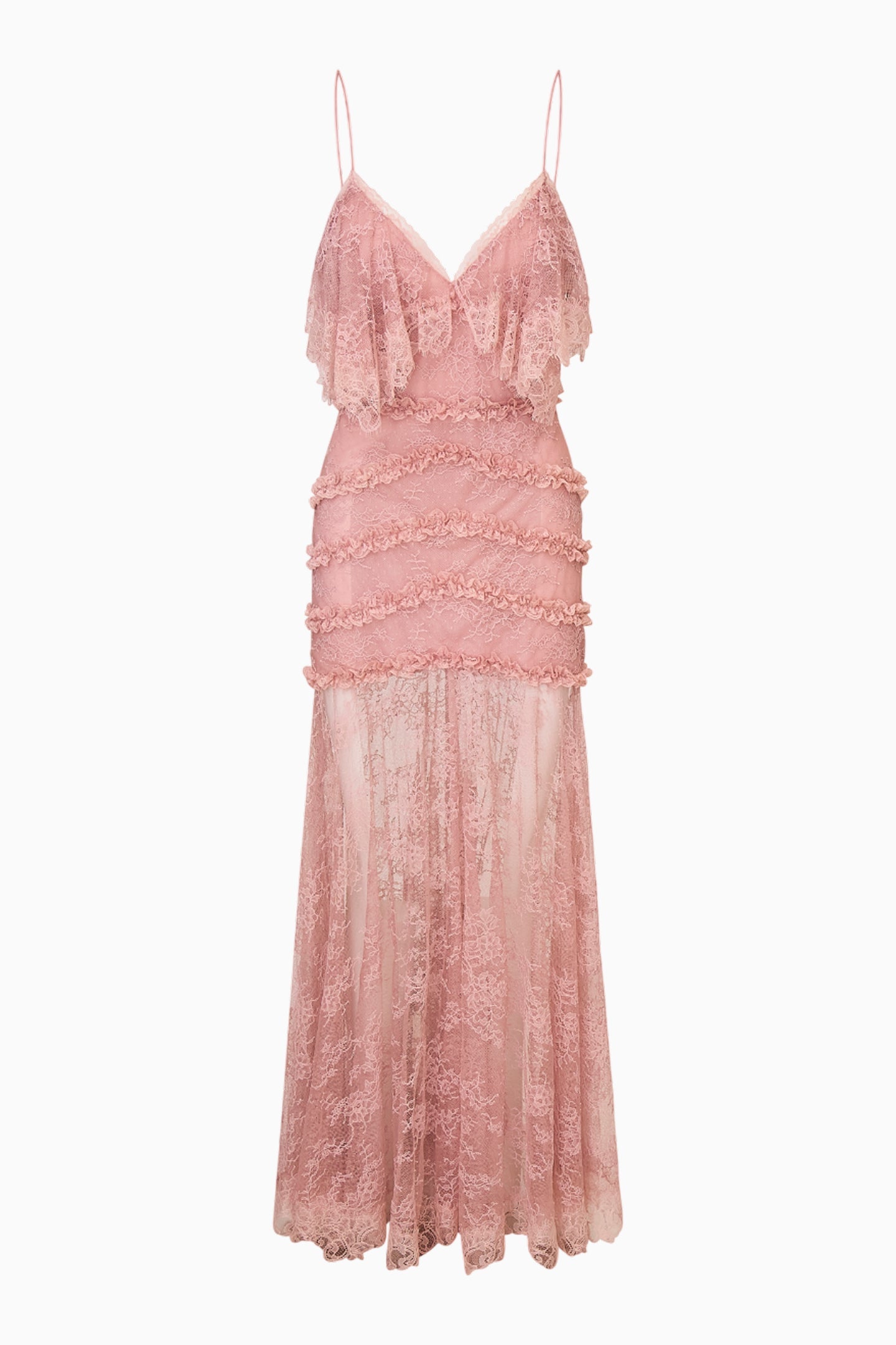 Romance takes center stage in our Sandy Dress, a breath-taking maxi crafted in our signature Chantilly lace. This bohemian-inspired silhouette skims the body with a slim, feminine fit through the hip and thigh before releasing into a dramatic, mermaid-style skirt. Draped lace adorns the chest, while cascading lace ruffles add ethereal texture throughout. Fully lined in airy chiffon, the lower skirt falls sheer from below the hip, offering a dreamy glimpse of leg with every step. Finished with delicate adjustable spaghetti straps and a sweeping floor-length hem, this stunner is Rebecca’s favorite for a reason.