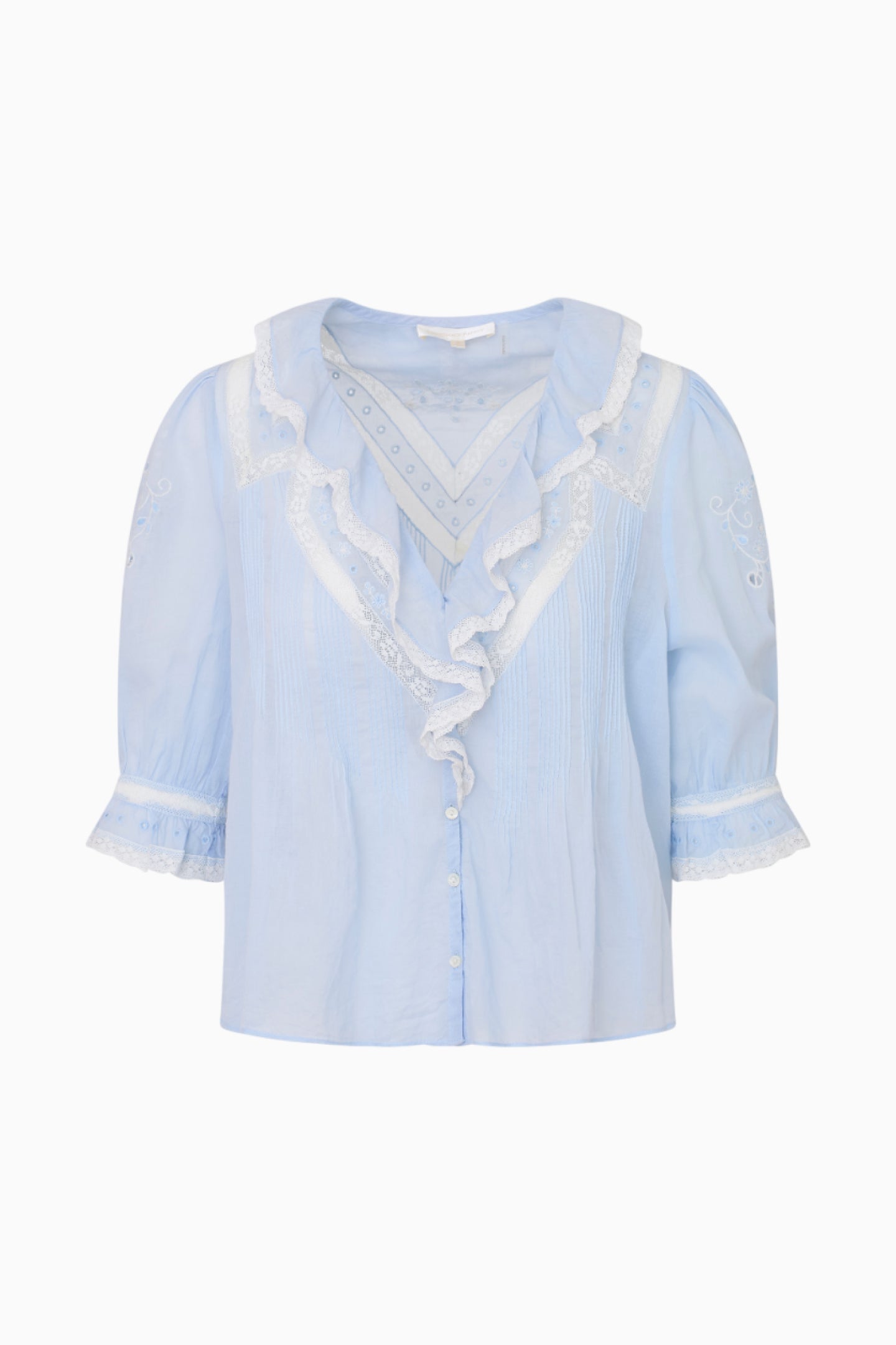 Introducing the Sinora Top. This charming top is designed using an ultra-thin, lightweight cotton voile fabric that’s crisp, but delicate for the high summer season. The short sleeve blouse features dancing embroidered florals all over, puff sleeves, buttons down center front adorned with gorgeous cascading ruffles along the neckline.