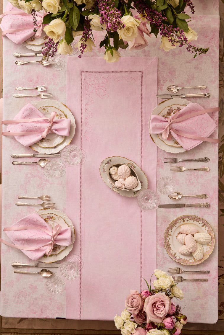 Put on the pretty with our vintage-inspired table runner. This table linen effortlessly elevates your tablescape with a stunning hand-dyed fabric. The runner features a double layer self, a latter trim, and charming bow embroidered on each corner. Pair with our Tablecloth for a coordinated look.