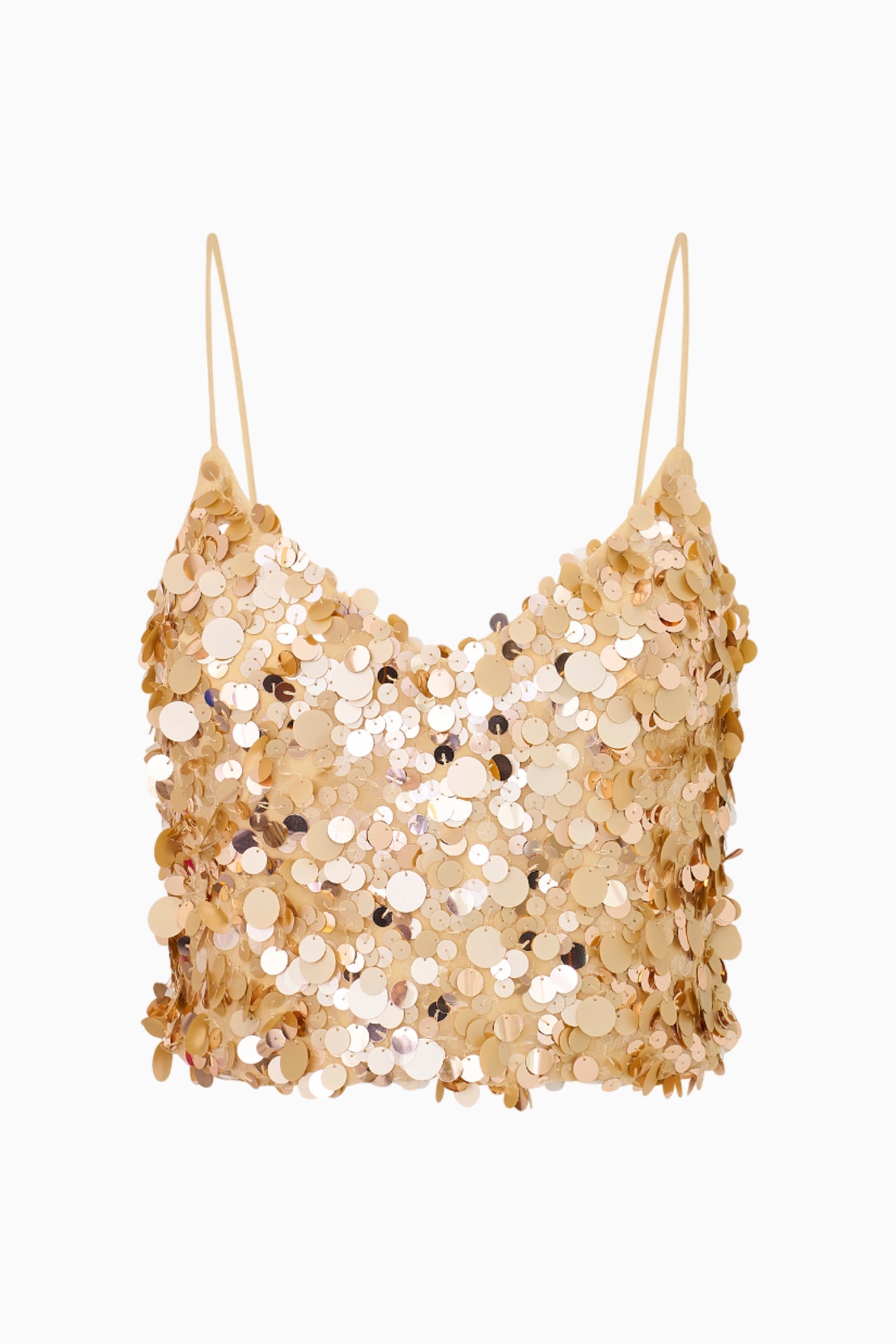 Channeling golden hour with the Vivaldina Top. The stunning party piece debuts with shimmering large payettes done in a beautiful gold. The cropped cami top features a zipper on the side, a comfy, but straight fit, and delicate spaghetti straps. Pair with the Vivadina Top for a full set.